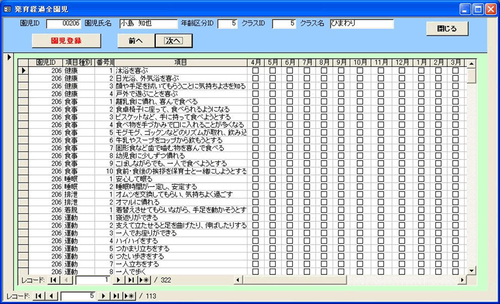 園で設定した発育経過項目ごとに、園児の発達を記録します。
